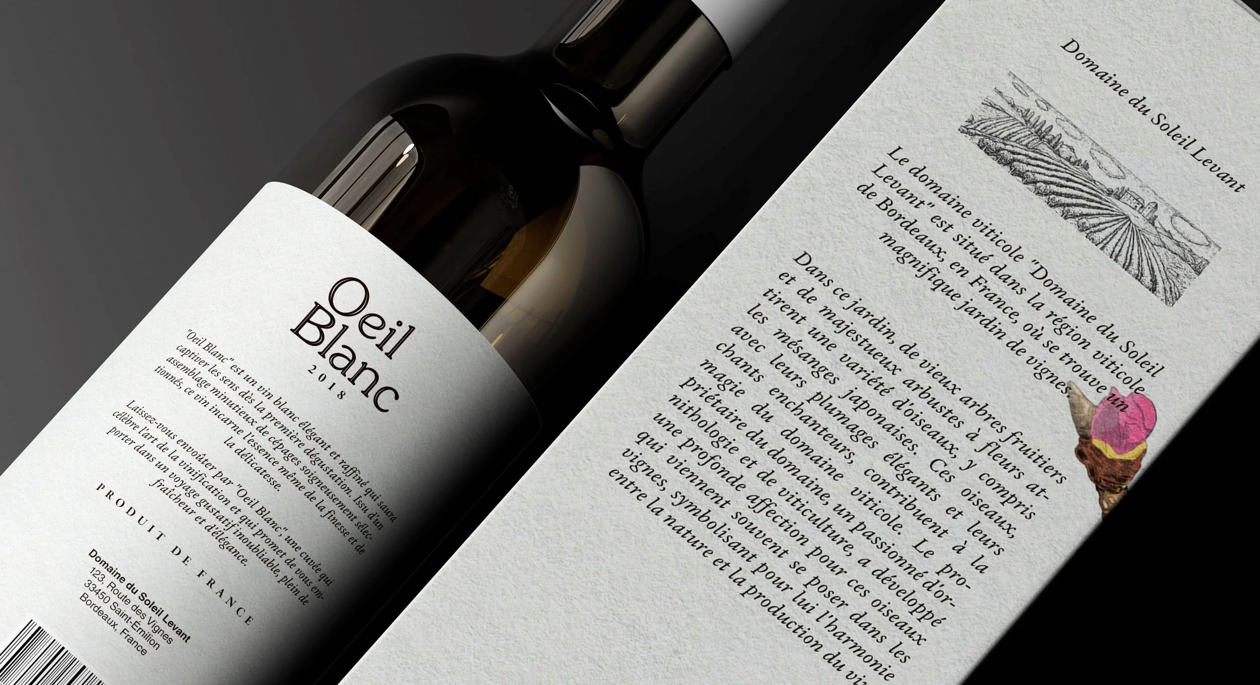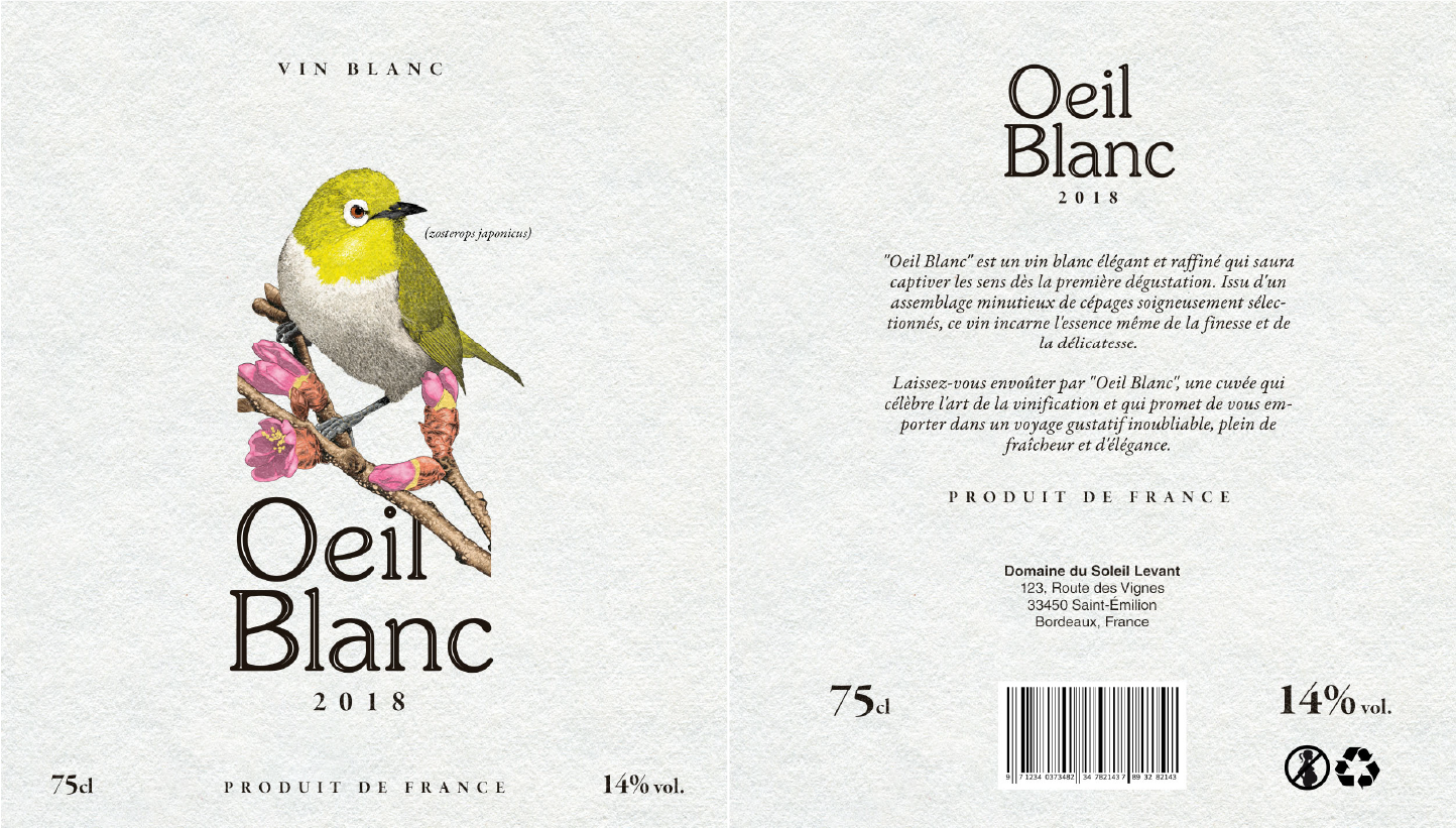 Pour la création de l'étiquette du vin, le concept d'élégance, de pureté et de douceur a été pris en considération. L'oiseau le plus connu sous le nom d' "œil blanc" est commun au Japon, ce qui explique en partie l'influence japonaise que l'on peut percevoir sur l'étiquette. La boîte qui renferme la bouteille de vin a été conçue comme un complément à l'ensemble du concept.